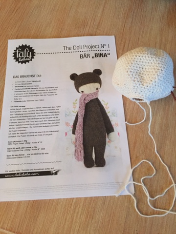 Auf der Suche nach einem Geschenk für ein 3jähriges Mädchen bin ich über diese absolut niedlichen Figuren von Lalylala gestolpert. Schwer fiel die Entscheidung, welche soll es werden. Das Angebot drei Anleitungen kostengünstiger zu erhalten, passte mir da ganz gut. Meine Entscheidung fiel dann doch auf Bina Bär. Vier Wochen habe ich Zeit, dann muss der Bär im Päckchen weg.Heute habe ich mit dem Kopf begonnen und ich war überrascht, wie schnell dieser dann doch fertiggestellt war.